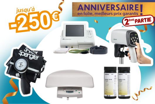 Pèse-bébé, moniteur foetal, video-colposcope, bandelettes urinaires, tensiomètre... en promotion Anniversaire !