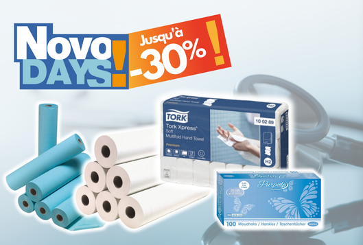 Draps d’examen, essuie-mains, essuie-tout, mouchoirs… en promotions pour les Novodays !